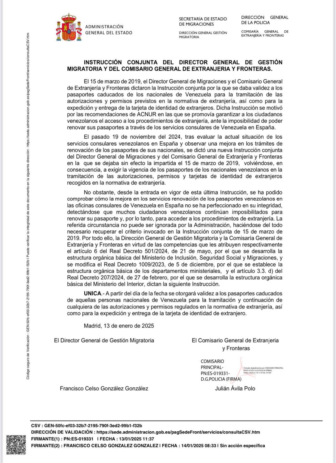 El 13 de enero de 2025, el Gobierno de España emitió una nueva instrucción que reitera la validez de los pasaportes caducados de nacionales venezolanos para la tramitación de autorizaciones, permisos y tarjetas de identidad de extranjero. Esta medida asegura que estas personas puedan continuar con su proceso de regularización sin obstáculos adicionales.